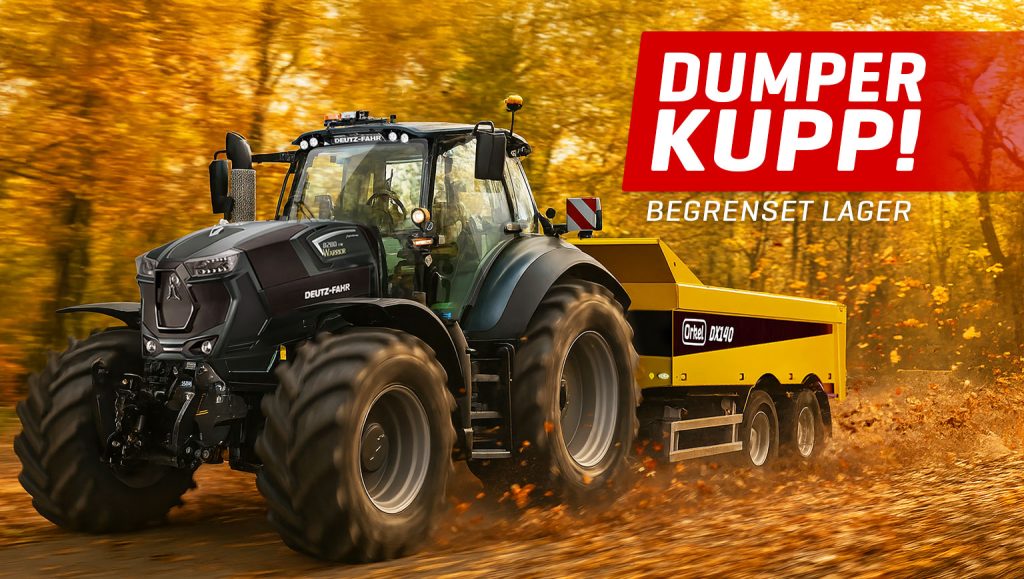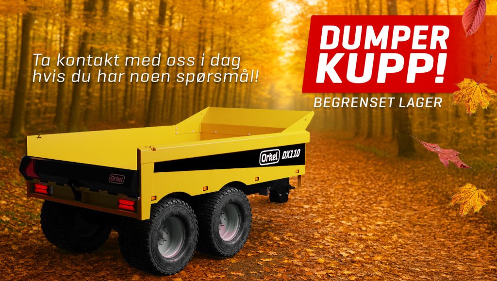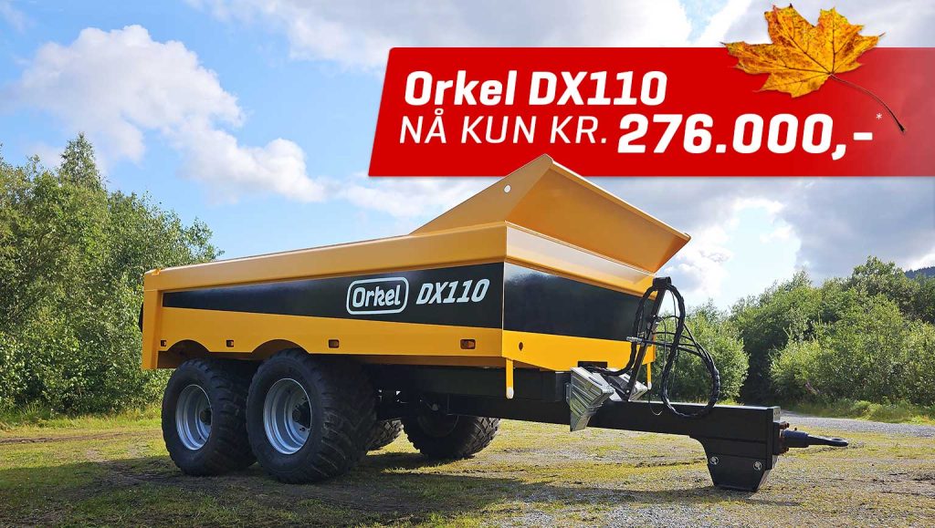 Orkel DX110 med 560/45R22,5 hjul og hydr.bakluke, selges nå til kr. 276.000,-* (Førpris kr. 296.640,-).