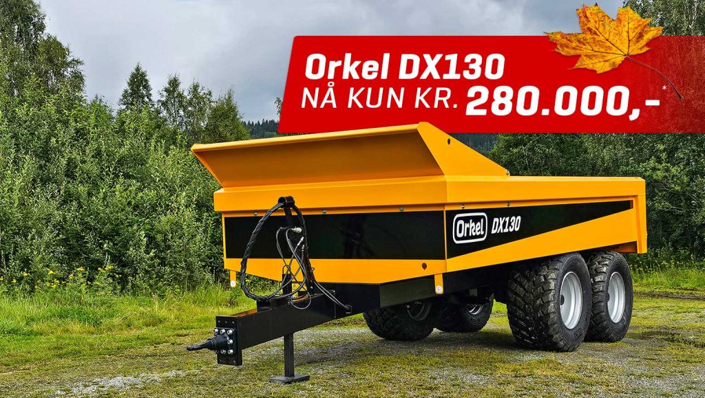 Orkel DX130 med 560/45R22,5 hjul og hydr.bakluke selges nå til kr. 280.000,-* (Førpris kr. 311 060,-).