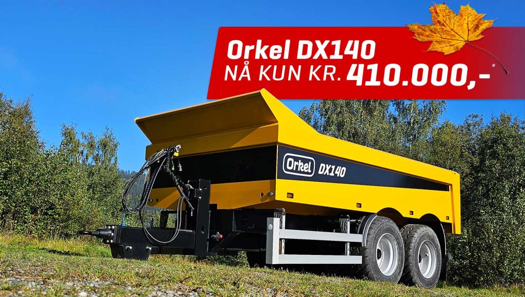 Orkel DX140 med 560/45R22,5 hjul og hydr.bakluke selges nå til kr. 410.000,-* (Førpris kr. 455 260,-).